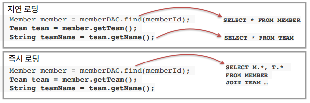 - 즉시 로딩: Join SQL로 한 번에 연관된 객체까지 미리 조회(멤버랑 팀이 웬만하면 같이 쓰일 때 유리)