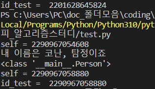 self의 값과 인스턴스된 id 값이 동일하다.