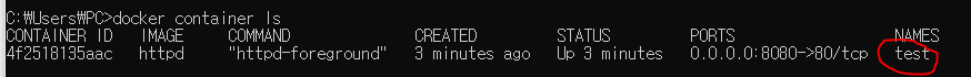 해석: name은 test로 하고 -d(백그라운드로), -p(포트번호)는 8080으로 httpd 이미지 실행.