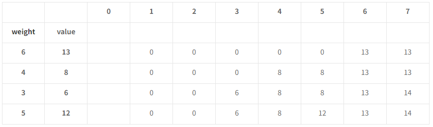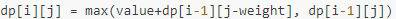 dp[i][j] = max(value+dp[i-1][j-weight], dp[i-1][j])