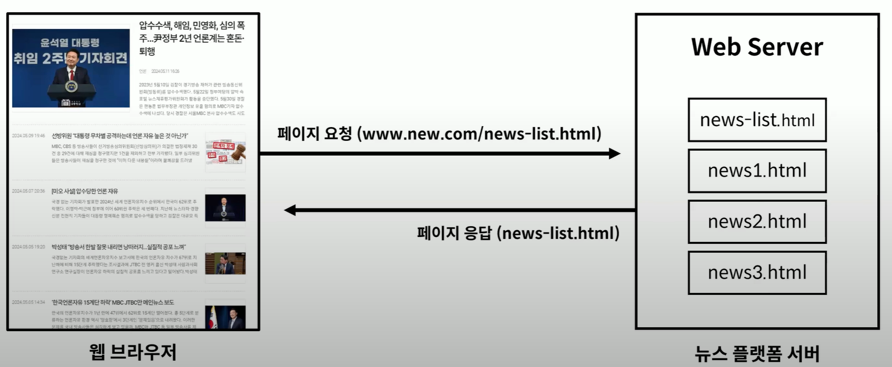 동적 컨텐츠: 서버에 저장된 HTML 파일 그대로 제공이 아닌, 동적으로 만들어지는 콘텐츠