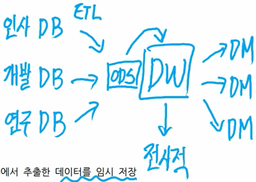 1) ETL을 통해서 데이터를 빼서 ODS에 임시 저장 후 DW에 적재(전사적으로 모은 거임)