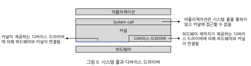 - system call 제공: 어플리케이션이 커널을 통해 하드웨어를 제어할 수 있는 함수