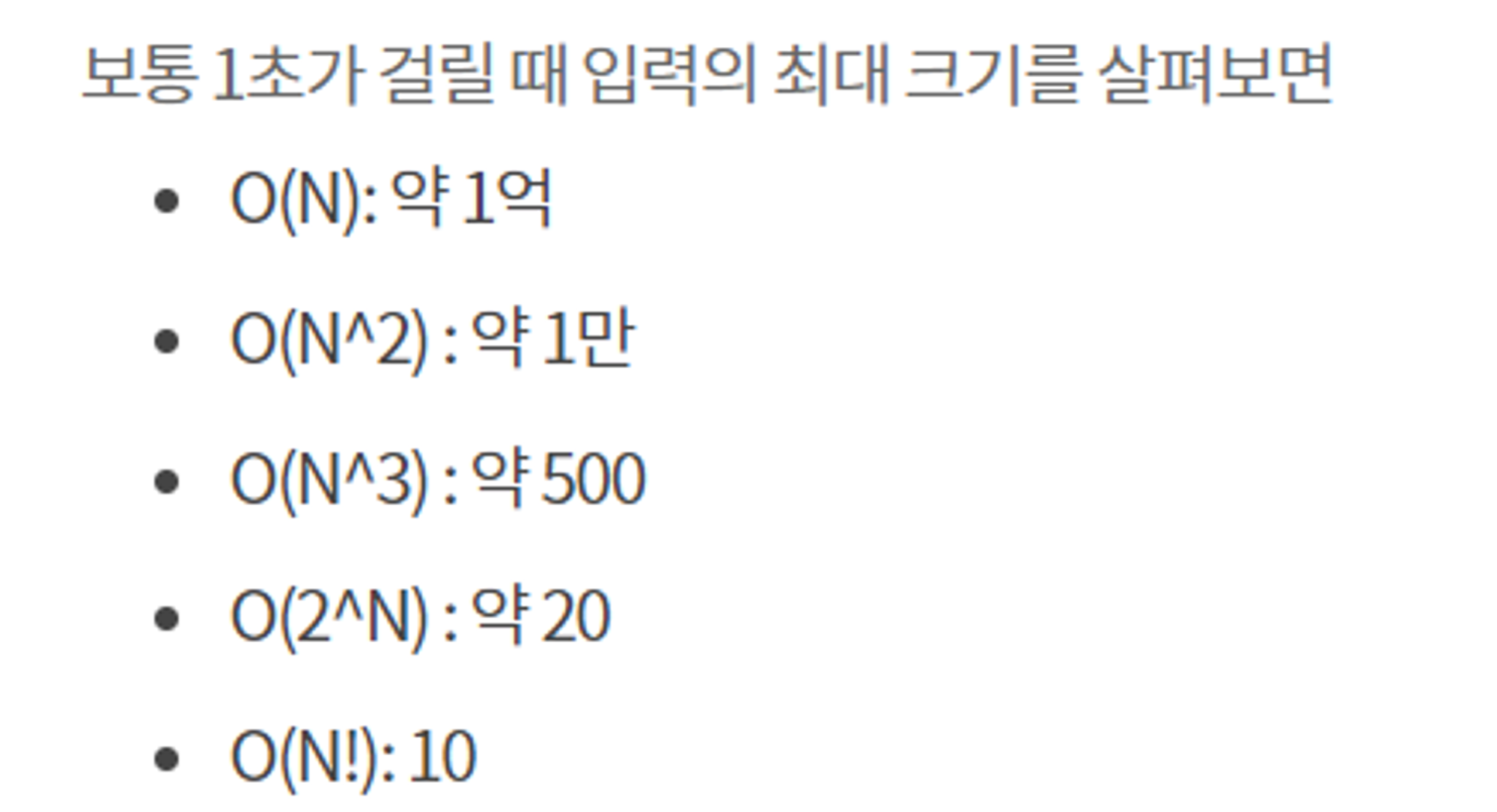 그러면 n과 시간복잡도 관계에 따른 핵심 알고리즘 추리로 빠른 문제 전개를 진행한다.