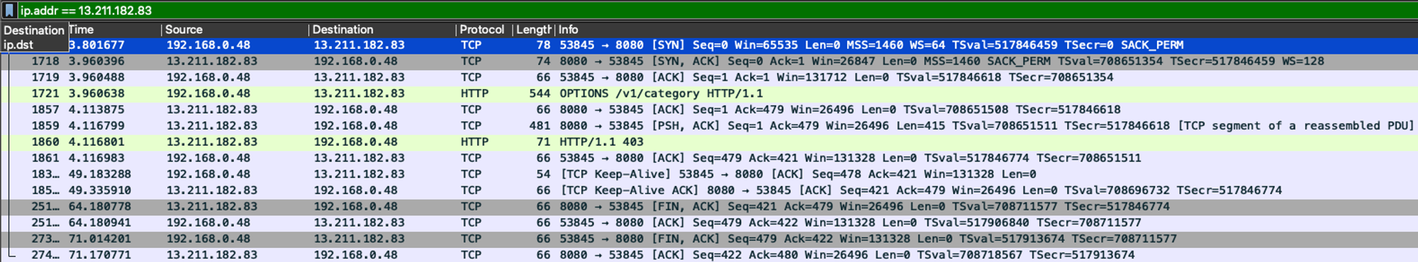 options요청(preflight)으로 보내기 시작하는데 하던 중 갑자기 403을 내려버려서 http요청을 받지도 못하고 종료되었다.