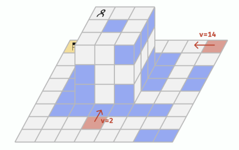 하지만 t=14일 때, <왼쪽 그림>처럼 시간 이동 현상 때문에 위로 갈 수 없다, 따라서 <오른쪽 그림> 처럼 28 이 정답입니다.